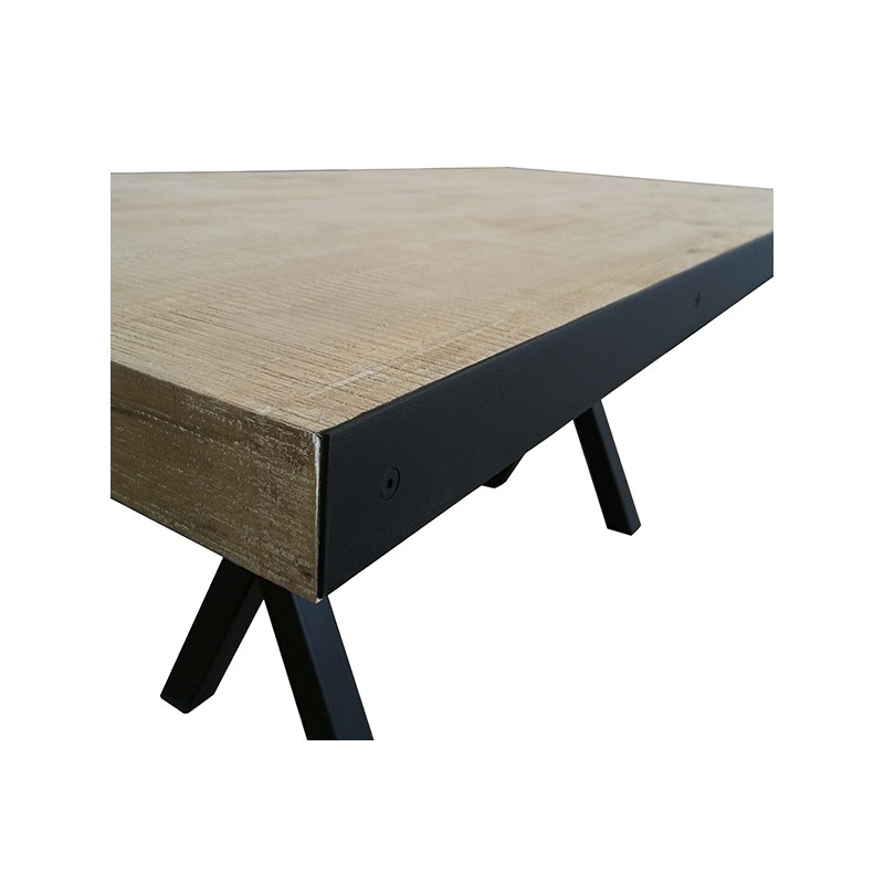Mesa comedor estancia-160, diseñada con madera sólida de pino, cepillada en la superficie, con detalles rústicos de madera avejentada. Posee herrería negra en base y laterales, que le da un acento contemporáneo.