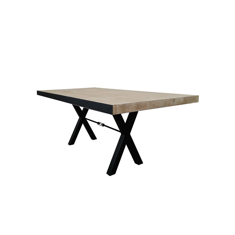 Mesa comedor estancia-160, diseñada con madera sólida de pino, cepillada en la superficie, con detalles rústicos de madera avejentada. Posee herrería negra en base y laterales, que le da un acento contemporáneo.