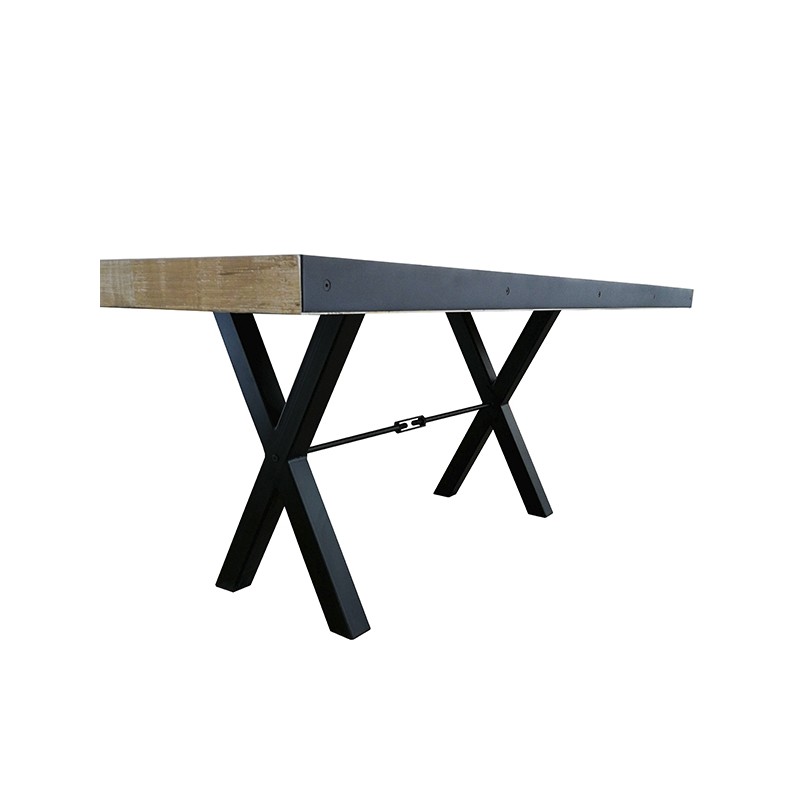 Mesa comedor estancia-160, diseñada con madera sólida de pino, cepillada en la superficie, con detalles rústicos de madera avejentada. Posee herrería negra en base y laterales, que le da un acento contemporáneo.