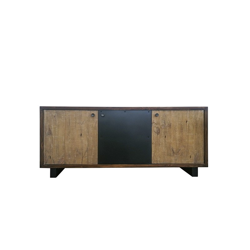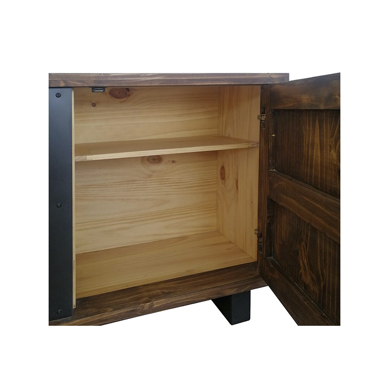Bufetera estancia 3 puertas, diseñada con madera sólida de pino, puertas cepilladas, con detalles rústicos de madera avejentada. Posee herrería negra en base, tiradores y puertas laterales, que le da un acento contemporáneo.