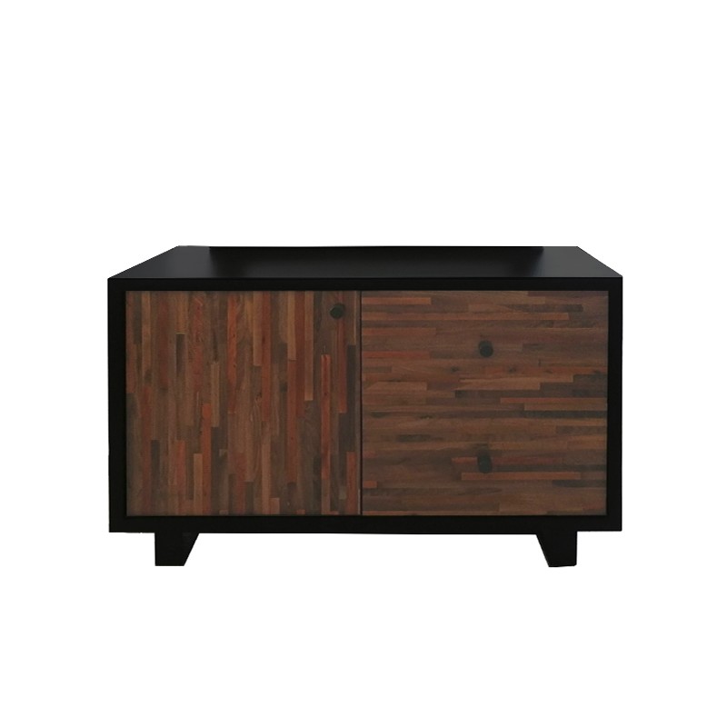 Bufetera 2 Cajones 1 Puerta reciclato, elaborada con pino negro y frente de cajones hechos con maderas nuevas y recuperadas. Tiradores cilíndricos y base de herrería sólida.