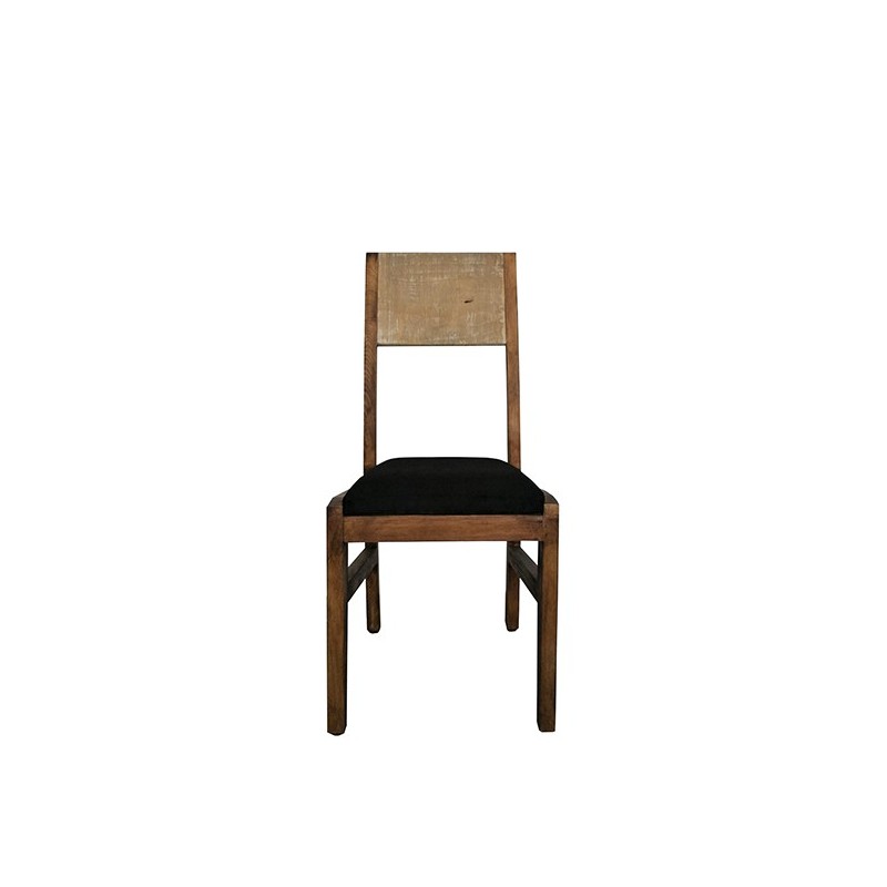 Silla estancia, diseñada con madera sólida de pino, cepillada en respaldo, con detalles rústicos de madera avejentada. Posee tapicería negra en pambazo, que le da un acento contemporáneo, moderno y elegante.