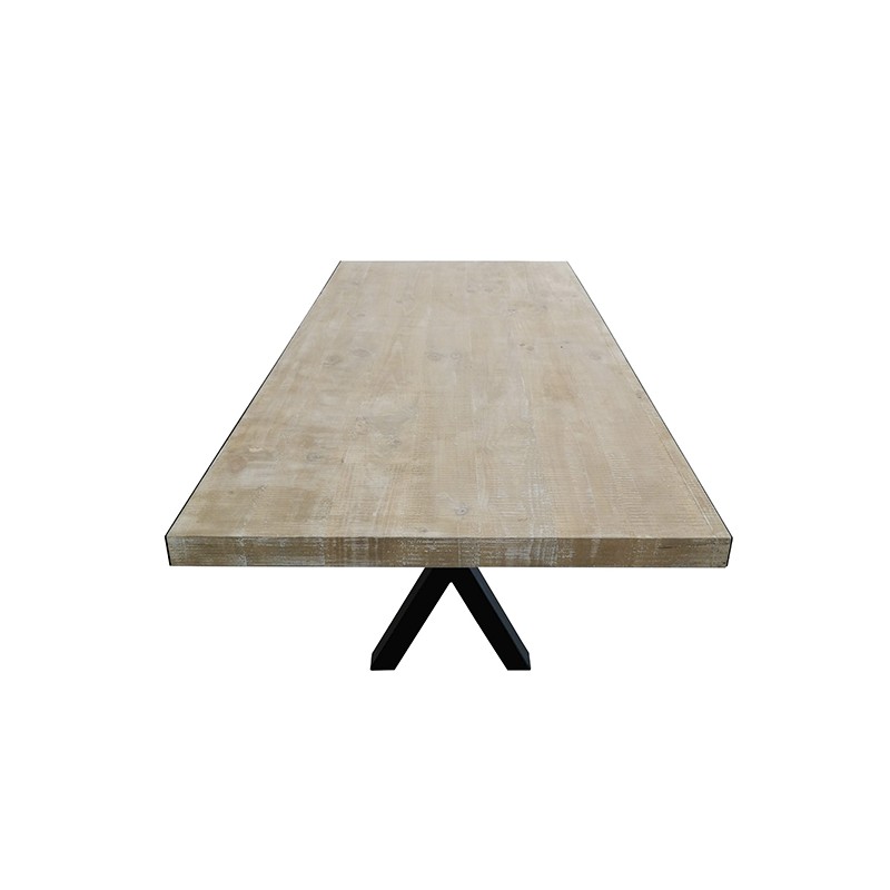 Mesa comedor estancia-160, diseñada con madera sólida de pino, cepillada en la superficie, con detalles rústicos de madera avejentada. Posee herrería negra en base y laterales, que le da un acento contemporáneo.